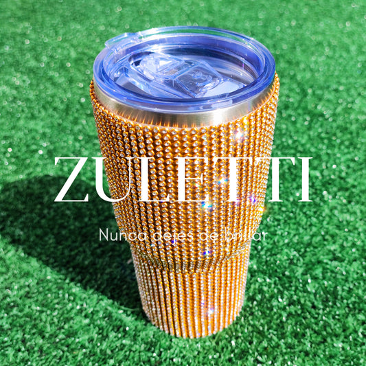 Vaso térmico Zuletti con brillos, tazón brillante de 600 ml con tapa antiderrames. Color dorado