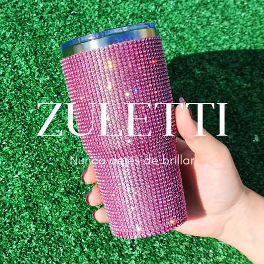 Vaso térmico Zuletti con brillos, tazón brillante de 600 ml con tapa antiderrames. Color rosado