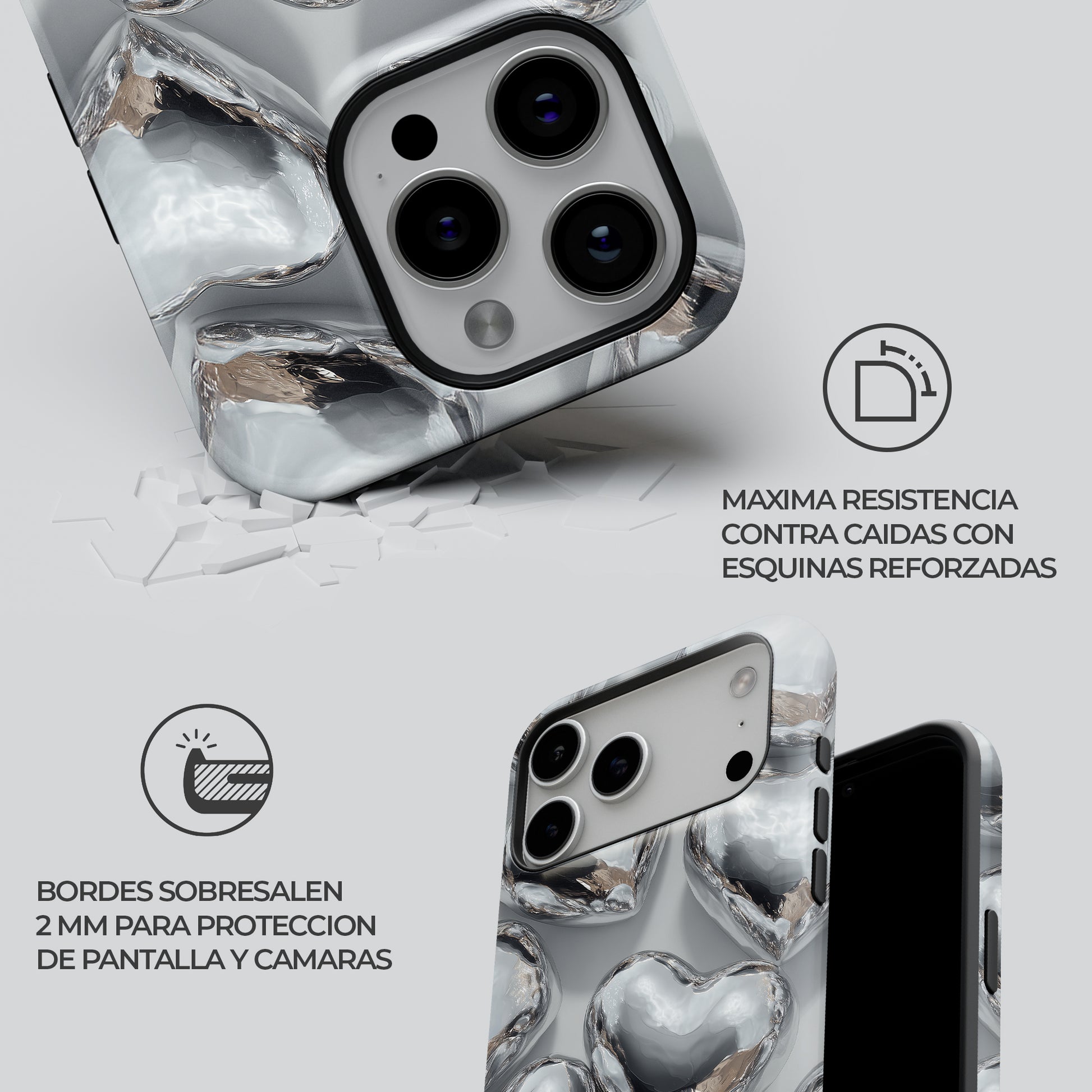 ¡Tu estilo, en modo premium! con Silver Heart. Este statement piece minimalista y reflectante inyecta vibras futuristas a tu feed. Su slim fit es puro glamour sin volumen, con protección shock-proof para que tengas cero pánico a las caídas.