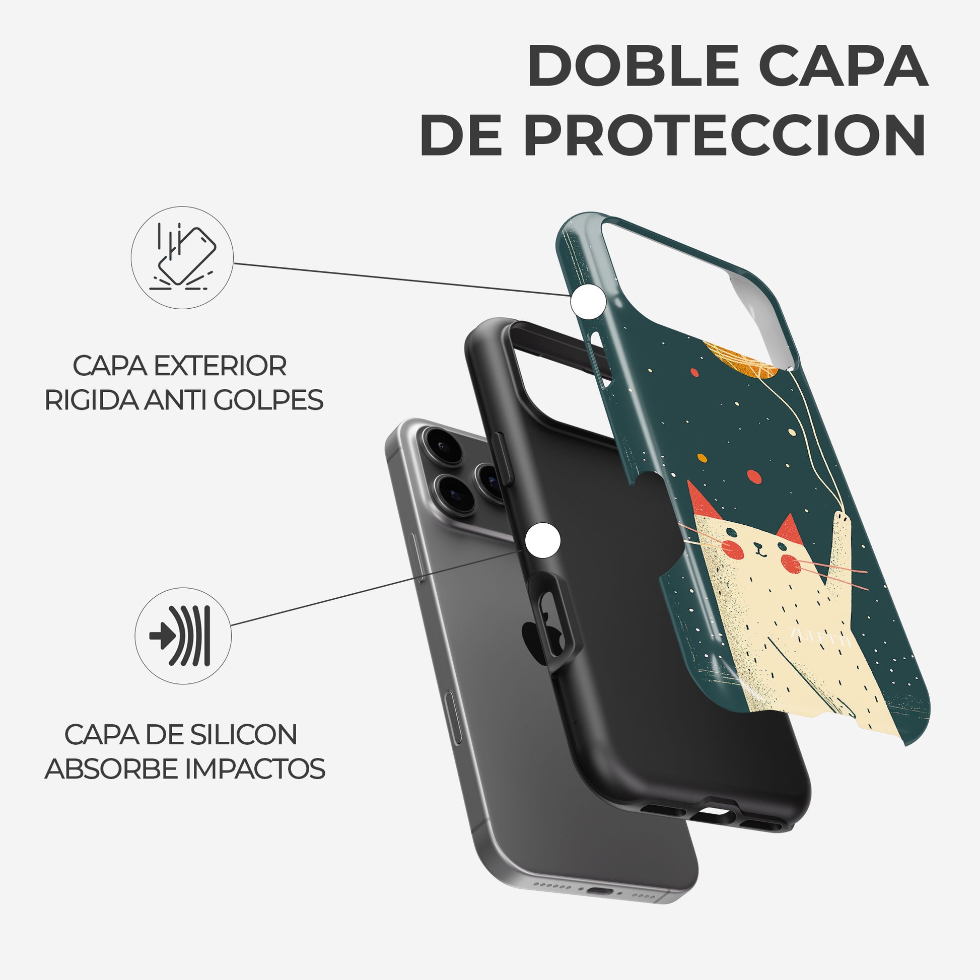 Canaliza tu vibe más tierno con Cozy Kitty. Este diseño artístico de gatito y ovillo es el statement piece acogedor que inyecta compliments y un look único a tu feed. Su slim fit con protección shock-proof te da cero pánico a las caídas. ¡Presume tu dulzura!