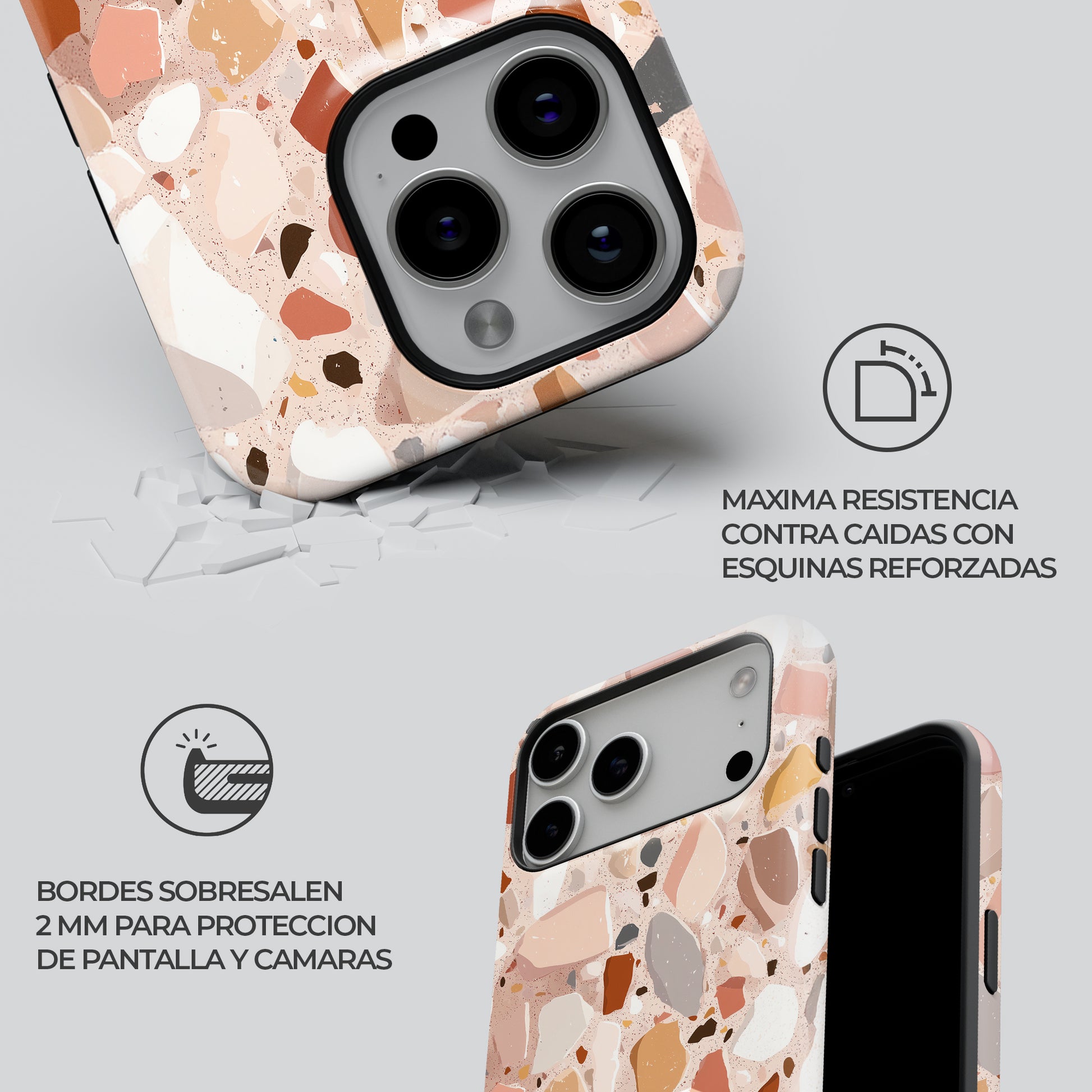 ¡Tu vibe es pura sofisticación! con Terrazzo Chic. Este diseño aesthetic de mosaico es el statement piece minimalista que inyecta glamour y compliments a tu feed. Su slim fit con protección shock-proof te da cero pánico a las caídas. ¡Define la tendencia y únete a la familia!